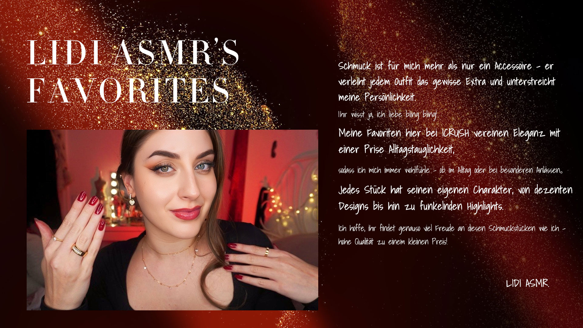 Willkommen bei den Favoriten von Lidi ASMR(@LidiASMR) – eine kuratierte Auswahl der beliebtesten Schmuckstücke von ICRUSH! Jedes Stück in dieser Kollektion wurde sorgfältig von Lidi ASMR ausgewählt und verkörpert die neuesten Trends, zeitlose Eleganz und den einzigartigen Stil, für den ICRUSH steht. Von minimalistischen Designs für den Alltag bis hin zu auffälligen Statement-Stücken für besondere Anlässe – diese Kollektion bietet etwas für jeden Schmuckliebhaber.
